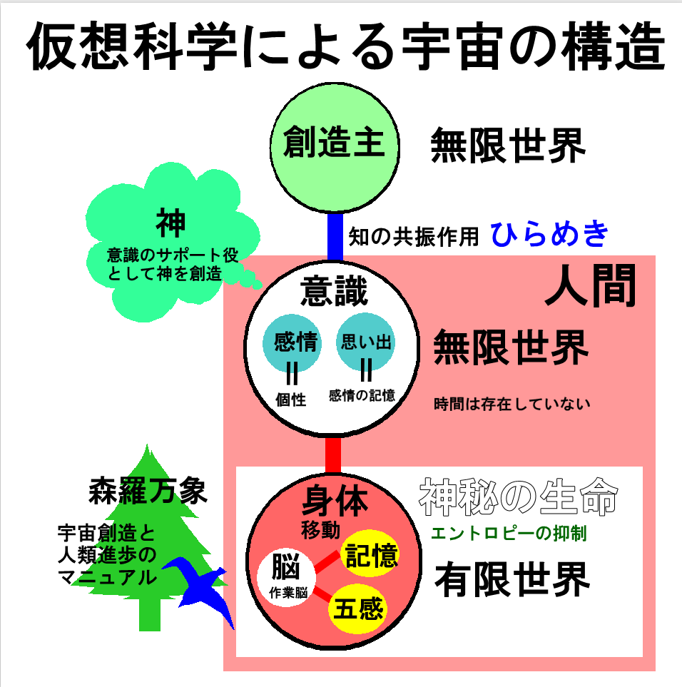 人間が必要な知は創造主の知と共振することによって得ることができる。これをひらめきという。このように宇宙の構造を考えた。どうだろうか?